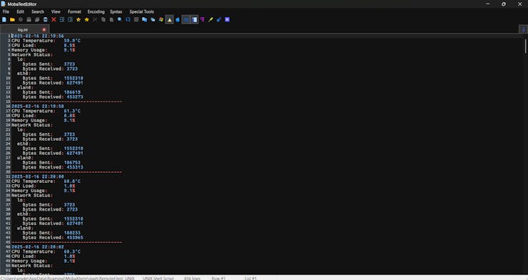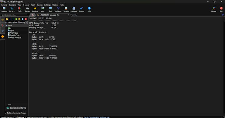 Real-Time Monitoring: Continuously monitor CPU temperature, CPU load, memory usage, and network status.Text-Based UI: Use the curses library to create a user-friendly, text-based interface.Data Logging: Save all the monitored data to a log file with timestamps for later analysis.Cross-Platform Compatibility: Easily run the script on various Raspberry Pi models.Ā