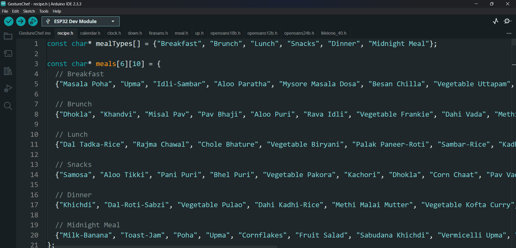 displayMainPage(): Shows current time, date, and instructionsdisplayMealPage(): Displays ingredients for selected mealdisplayRecipePage(): Shows step-by-step cooking instructions3. Core Logic