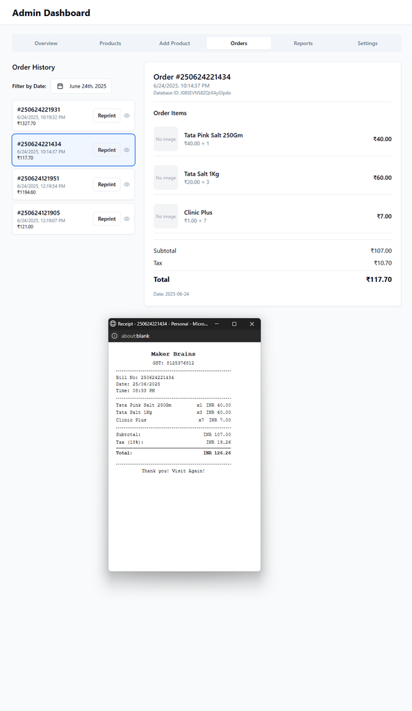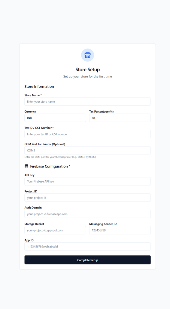 State Management: App state and settings (like Firebase credentials, store details, and printer config) are stored locally in a secure config file.