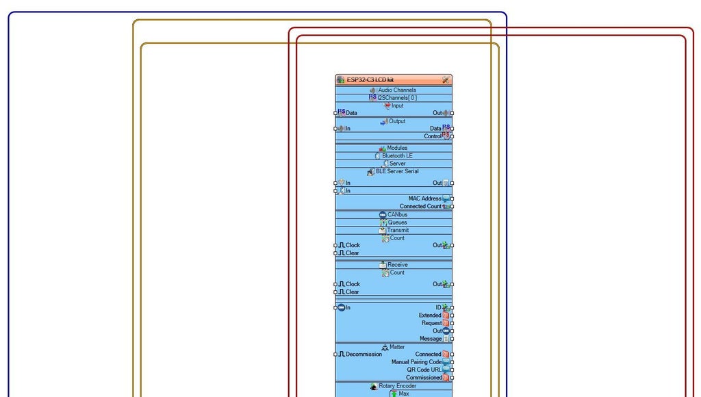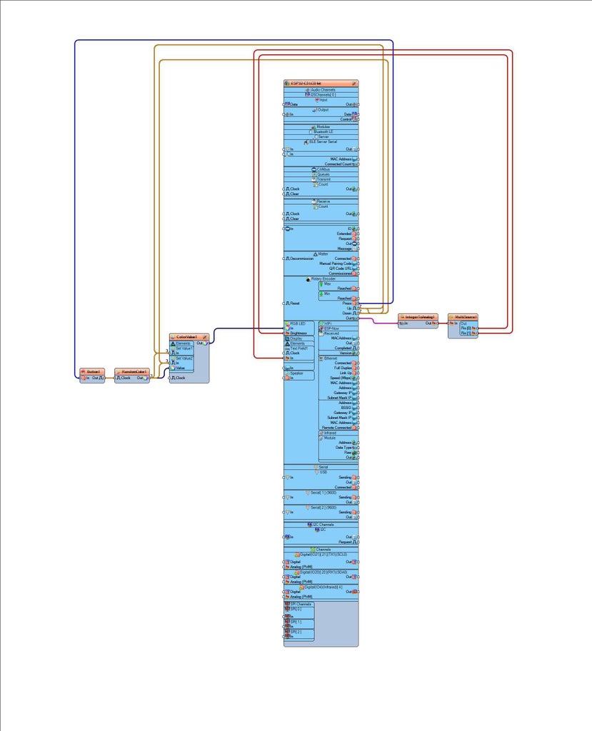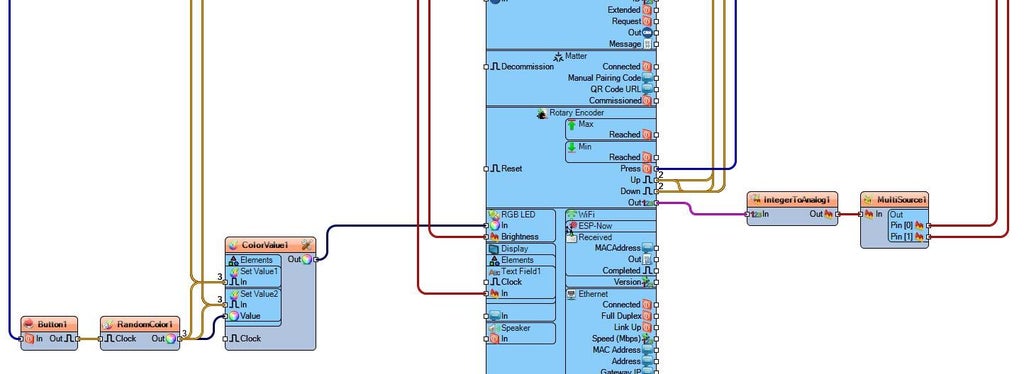 Connect "ESP32-C3 LCD kit" > "Rotary Encoder" Pin [Out] to "IntegerToAnalog1" Pin [In]Connect "IntegerToAnalog1" Pin [Out] to "MultiSource1" Pin [In]Connect "MultiSource1" Pin [0] to "ESP32-C3 LCD kit" > "RGB LED" Pin [Brightness]Connect "MultiSource1" Pin [0] to "ESP32-C3 LCD kit" > "Display" > "Text Field1" Pin [In]Connect "ESP32-C3 LCD kit" > "Rotary Encoder" Pin [Press] to "Button1" Pin [In]Connect "Button1" pin [Out] "RandomColor1" Pin [Clock]Connect "RandomColor1" Pin [Out] "ColorValue1" > "Set Value2" Pin [Value]Connect "RandomColor1" Pin [Out] "ColorValue1" > "Set Value2" Pin [In]Connect "RandomColor1" Pin [Out] "ColorValue1" > "Set Value1" Pin [In]Connect "ESP32-C3 LCD kit" > "Rotary Encoder" Pin [Up] to "ColorValue1" > "Set Value1" Pin [In]Connect "ESP32-C3 LCD kit" > "Rotary Encoder" Pin [Down] to "ColorValue1" > "Set Value1" Pin [In]Connect "ESP32-C3 LCD kit" > "Rotary Encoder" Pin [Up] to "ColorValue1" > "Set Value2" Pin [In]Connect "ESP32-C3 LCD kit" > "Rotary Encoder" Pin [Down] to "ColorValue1" > "Set Value2" Pin [In]Connect "ColorValue1" Pin [Out] to "ESP32-C3 LCD kit" > "RGB LED" Pin [In]Ā