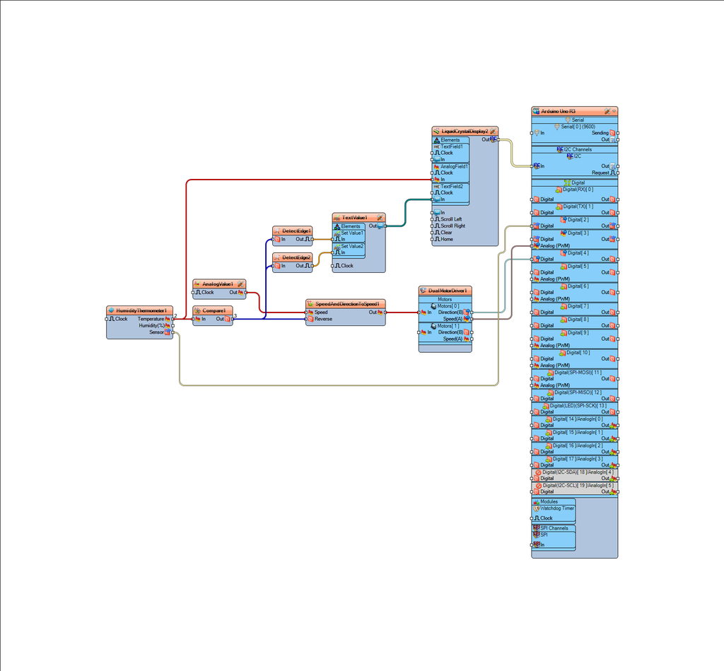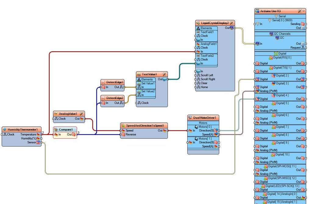 Connect "HumidityThermometer1" pin[Temperature] to "Compare1" pin[In]Connect "HumidityThermometer1" pin[Temperature] to "LiquidCrystalDisplay1" > "Analog Field1" pin[In]Connect "HumidityThermometer1" pin[Sensor] to Arduino digital pin[2]Connect "AnalogValue1" pin [Out] to "SpeedAndDirectionToSpeed1" pin [Speed]Connect "Compare1" pin [Out] to "DetectEdge2" pin [In]Connect "Compare1" pin [Out] to "DetectEdge1" pin [In]Connect "Compare1" pin [Out] to "SpeedAndDirectionToSpeed1" pin [Reverse]Connect "DetectEdge1" pin [Out] to "TextValue1.Elements.Set Value1" pin [In]Connect "DetectEdge2" pin [Out] to "TextValue1.Elements.Set Value2" pin [In]Connect "SpeedAndDirectionToSpeed1" pin [Out] to "DualMotorDriver1.Motors.Item[0]" pin [In]Connect "LiquidCrystalDisplay1" pin [I2C Out] to "Arduino.I2CChannels.I2C" pin [In]Connect "DualMotorDriver1" > [Motors.Item[0].Direction] pin [Out] to "Arduino" pin Digital pin [4]Connect "DualMotorDriver1" > [Motors.Item[0].Speed] pin [Out] to "Arduino" pin Digital > Analog PWM pin [3]