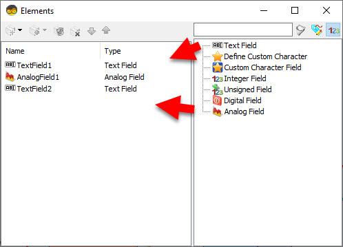 Double click on the "TextValue1" and in the Elements window drag "Set Value" to the left side and in the properties window set "Value" to LOWDrag another "Set Value" to the left side and in the properties window set "Value" to MEDIUMDrag another "Set Value" to the left side and in the properties window set "Value" to HIGHDouble click on the "LiquidCrystalDisplay1" and in the Elements window drag "Text Field" to the left side and in the properties window set "Initial Value" to VALUE: and "Width" to 6Drag another "Text Field" to the left side and in the properties window set "Row" to 1in the Elements window drag "Analog Field" to the left side and in the properties window set "Column" to 7 and "Width" to 10 and "Precision" to 2