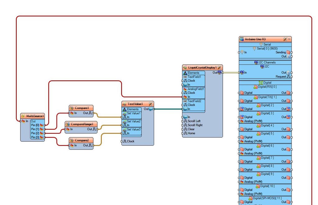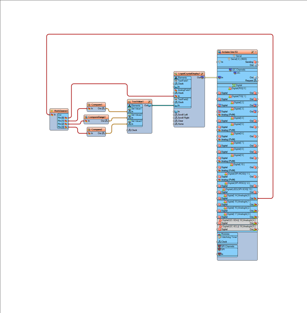 Connect Arduino Analog pin [ 0 ] to "MultiSource1" pin [In]Connect "LiquidCrystalDisplay1" pin [I2C Out] to "Arduino.I2CChannels.I2C" pin [In]Connect "MultiSource1" Pin [0] to "LiquidCrystalDisplay1" > "AnalogField1" pin [In]Connect "MultiSource1" Pin [1] to "Compare1" pin [In]Connect "MultiSource1" Pin [2] to "CompareRange1" pin [In]Connect "MultiSource1" Pin [3] to "Compare2" pin [In]Connect "Compare1" pin [Out] to "TextValue1" > "Set Value1" Pin [In]Connect "CompareRange1" pin [Out] to "TextValue1" > "Set Value2" Pin [In]Connect "Compare2" pin [Out] to "TextValue1" > "Set Value3" Pin [In]Connect "TextValue1" Pin[Out] to "LiquidCrystalDisplay1" > "TextField2" pin [In]