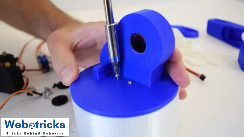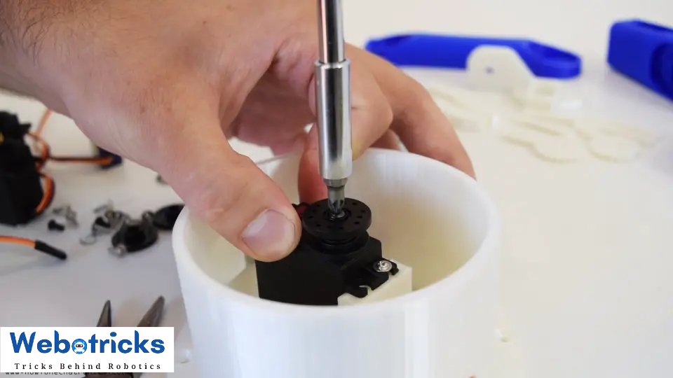 Here again first goes servo, then the round horn onto the next part, and then they are secured to each other using the bolt on the output shaft.